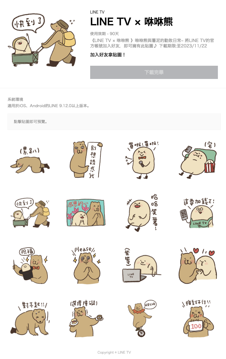 2023/10/24起至11/22,加入LINE TV官方好友,即可免費下載LINE TV與咻咻熊合作的獨家貼圖!(⚠️請詳閱活動辦法)