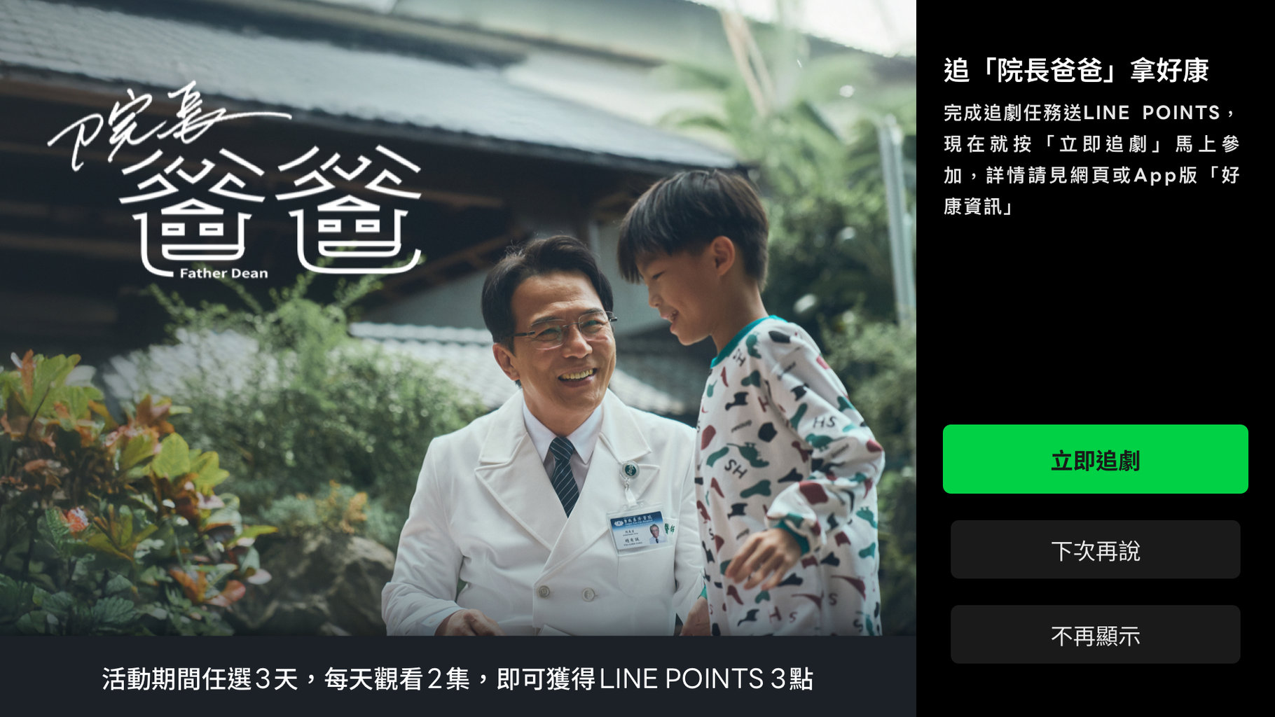 ◉參加活動不須點擊「本活動頁綠色按鈕」,觀看前請先至電視版 App ,至開機圖點選【立即追劇】按鈕完成報名,並依「得點步驟」完成活動指令後,方可獲取點數。電視版 App 係指在 Apple TV 透過 App Store 或 Android TV 透過 Google Play 安裝的 LINE TV App。