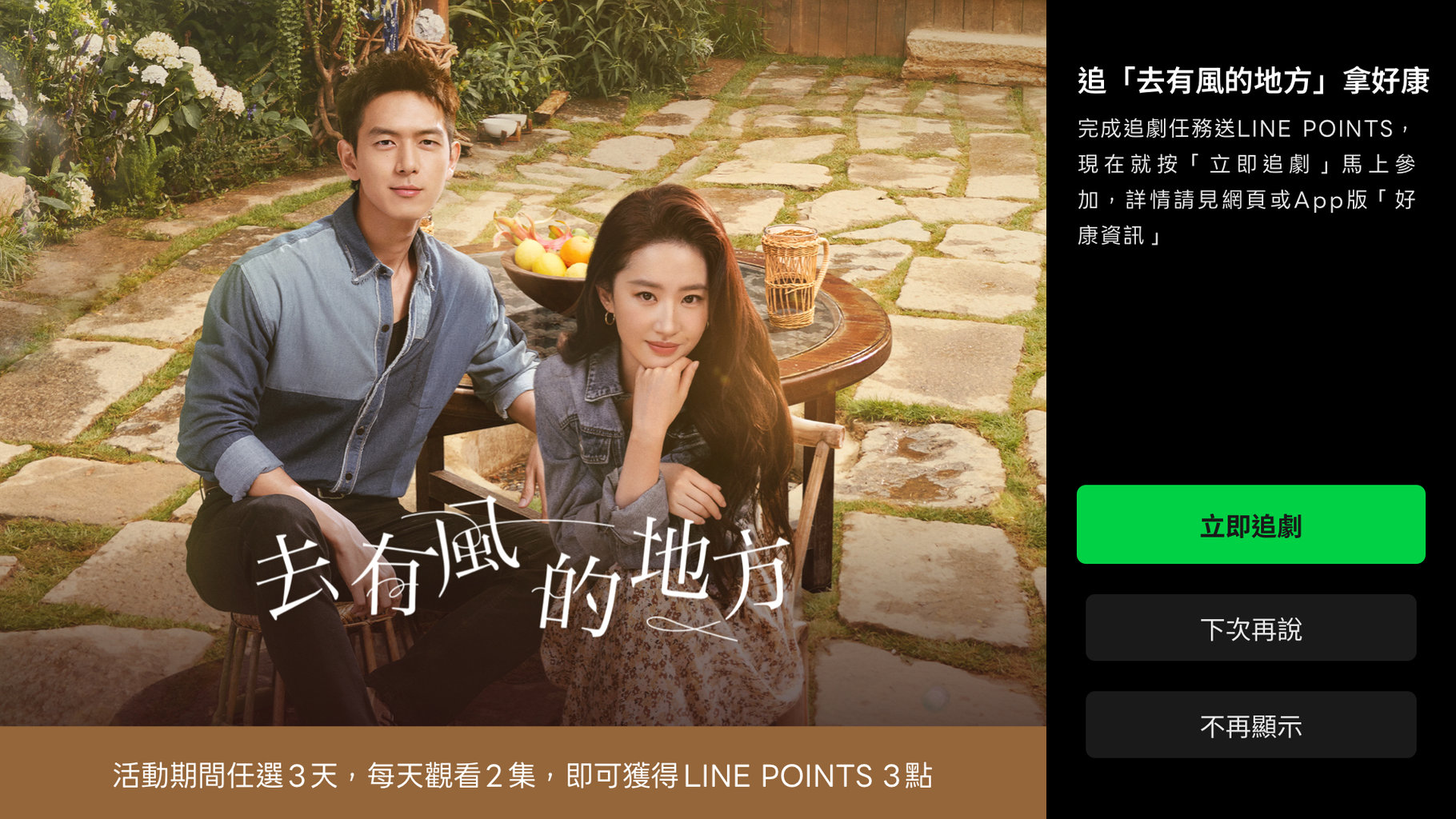 【電視版App限定追劇贈點】😍和帥哥談場聊癒系戀愛~追「去有風的地方」拿好康,完成任務得LINE POINTS 3點~