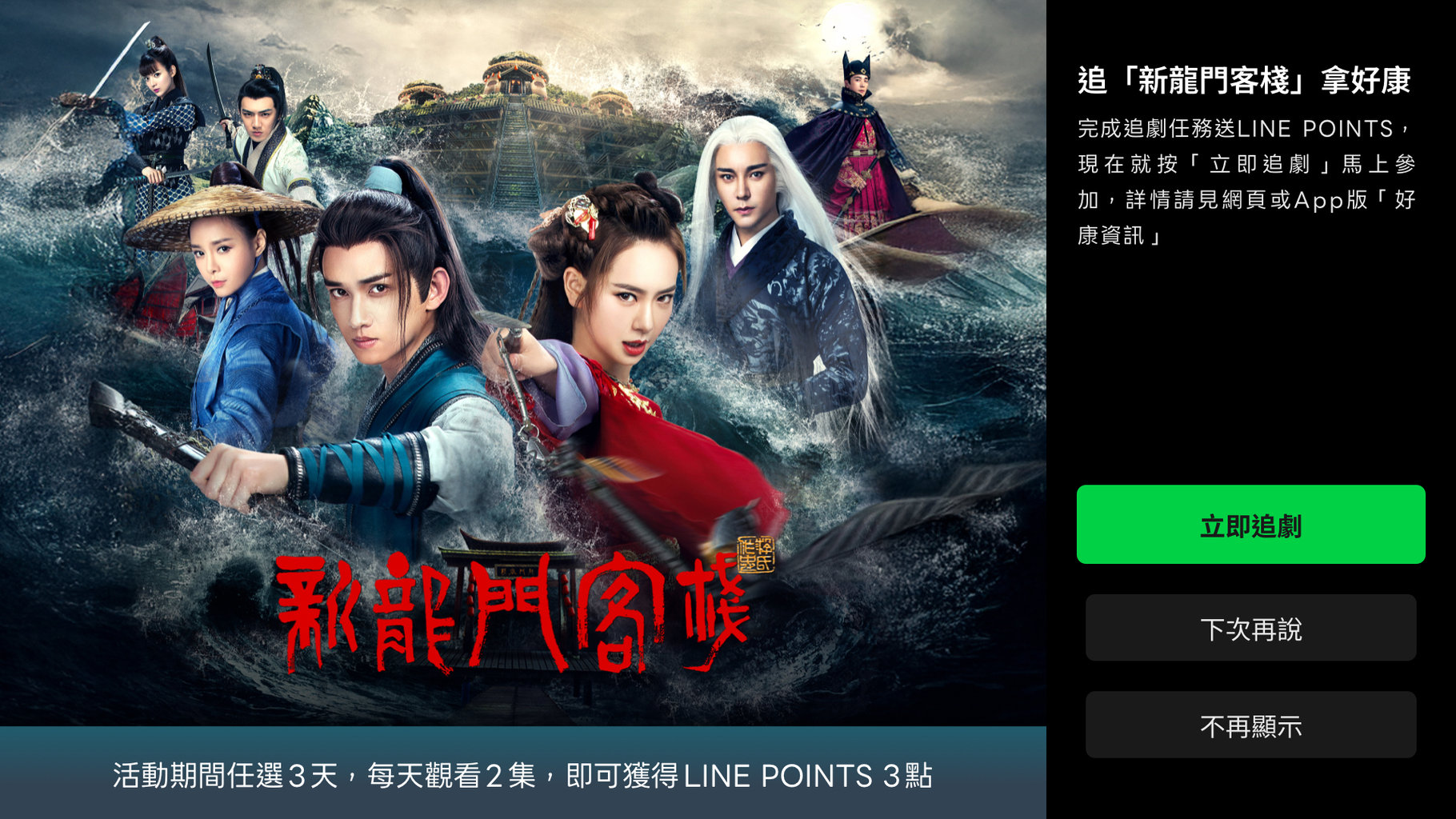 【電視版App限定追劇贈點】😍金庸經典之作~追「新龍門客棧」拿好康,完成任務得LINE POINTS 3點~