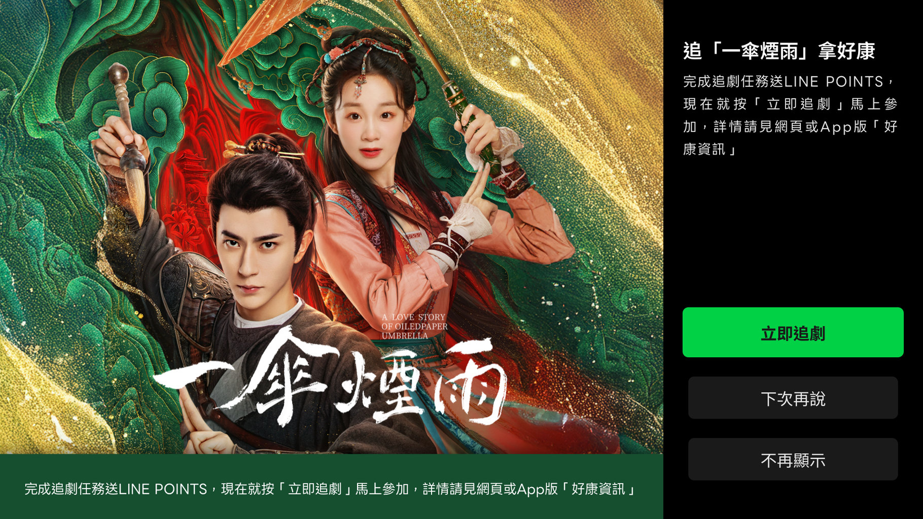 【電視版App限定追劇贈點】于朦朧♡李子璇甜蜜師徒戀~追「一傘煙雨」拿好康,完成任務得LINE POINTS 3點~