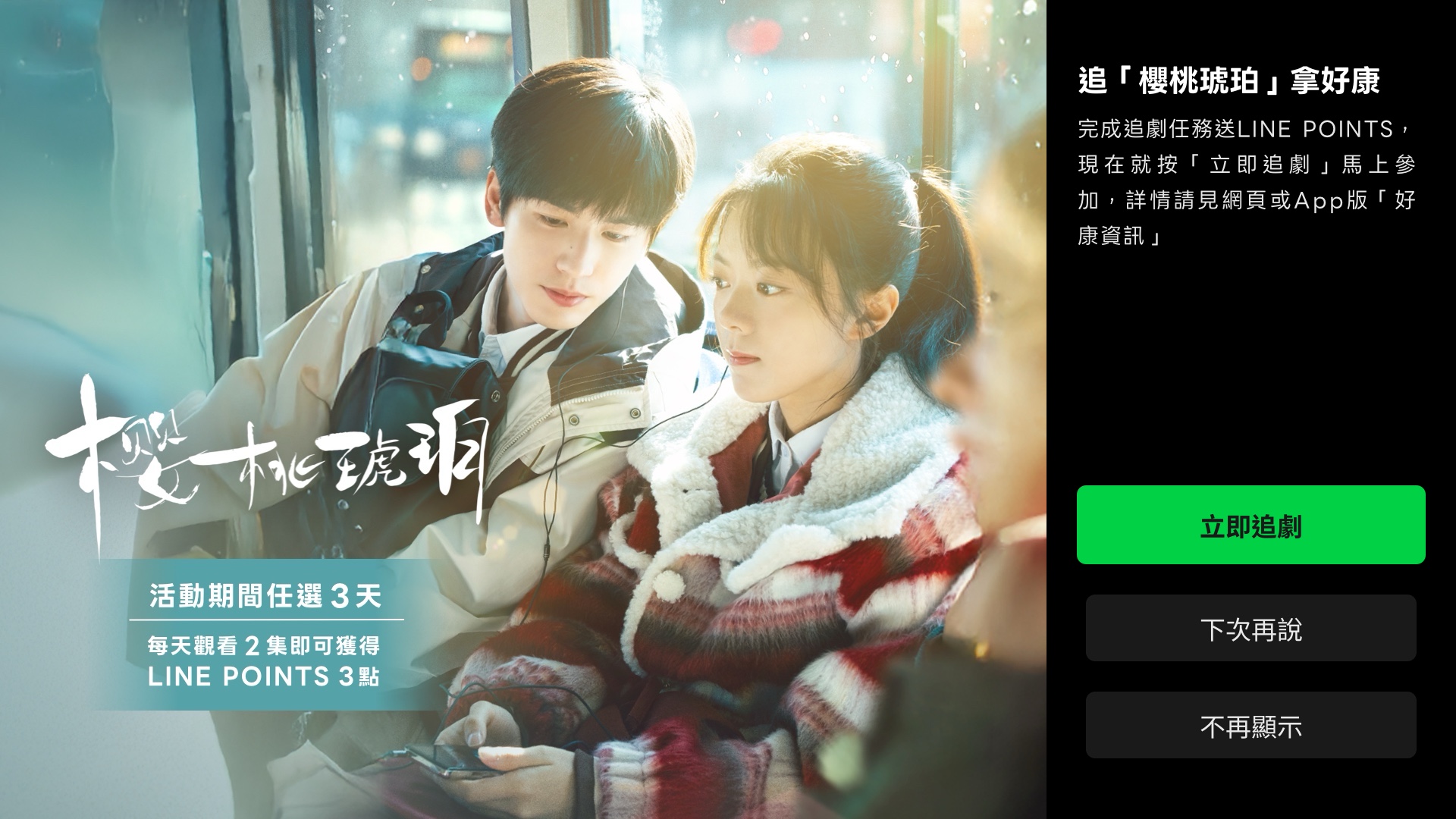 【電視版App限定追劇贈點】張凌赫♡趙今麥青春校園♡追「櫻桃琥珀」拿好康,完成任務得LINE POINTS 3點~