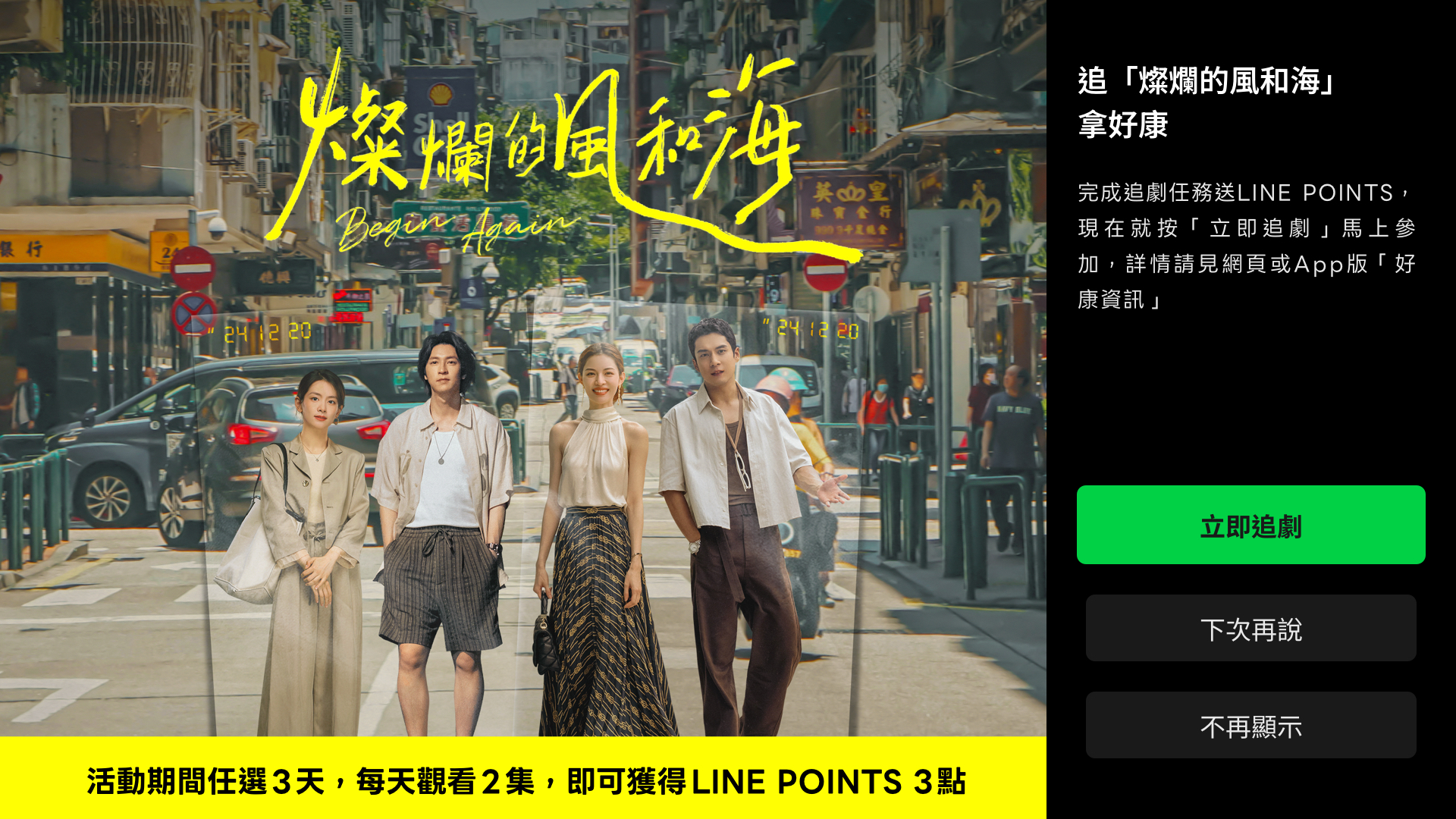 活動期間內,任選3天(含)並以電視版APP的LINE TV 「每天完整觀看」指定戲劇「任2集」(整個活動期間內,觀看的戲劇集數均不可重複,如以手機 App 或網頁版觀看則不符合活動資格)