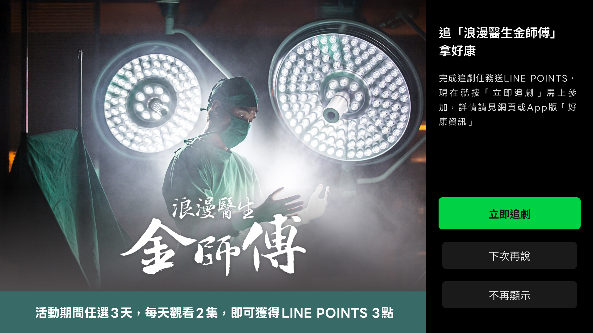 【電視版App限定追劇贈點】醫療劇天花板♡~追「浪漫醫生金師傅」拿好康,完成任務得LINE POINTS 3點~